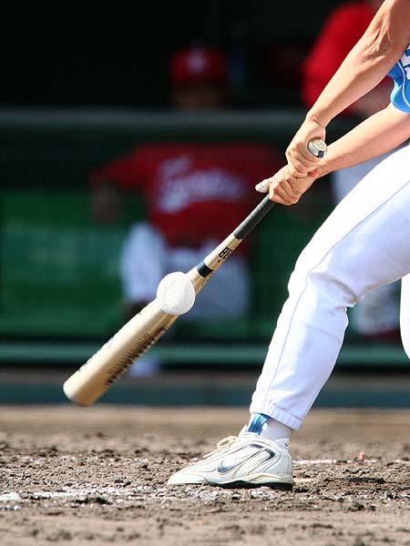 4試合でなんと バットに当たっている瞬間を捉えたのは4枚。 おしいってのは20枚くらい あとは オイラが振り遅れ ばっかりw 連射は バットのスイングスピードからすれば3コマしか撮れません。 その3コマは ふりはじめが1 当たるあたらないが2 ふりきりが3 って感じ これは、1秒間に6.5コマ撮れる40Dでの話。 最新の 1DMkIIIで 1秒10コマとしても このスイングという瞬間では1コマ増えたらいいところ。