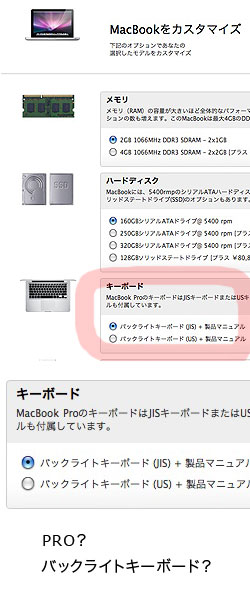 詳しいスペックは知らなくともこの画面で 解るのですが。 赤マークのところ。 MacBook Proは とあります。 まぁ 誤植だろうと思ってた。 でも それは JISかUSが選べるというところに関しての意味合い。 そして その下のバックライトキーボード JIS US の選択画面。 どうみても バックライトキーボード と書いてあります。