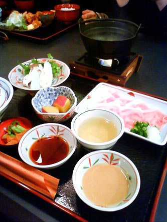 予定はトンカツだったのだけれど 豚がおいしいなら あの甘み旨味がわかるものが本当はいいなと思っていたら 冬季限定メニューで 八鹿豚しゃぶというのがあったのでそれにした。 でてきた肉は うっすうっすの 超薄型 透けてます。