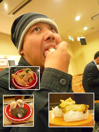 回転寿し とっぴぃ〜船で一緒にいた北海道人 YayoiさんにGoさんが教えてもらったお店。閉店間際に駆け込む!回っているネタはなんとはまぐりに、あわびに・・・この時点で普通の回転寿しではない!そして定番のネタたち!味は まったく 魚臭くない!つまり鮮度が高い!サーモンもあの気分がわるくなりそうなってのも一切ない!回転寿しですよ!ネタ でかい!さび 多い!とりあえず 小樽きたら寿司を食え!というのは 毎度のことです。覚えておいてください。