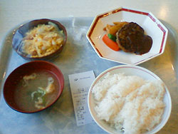さてさて たまにはフェリーのレストランで夕食と思い メニューの書かれたポスターをみてみると... 『ザ めしや』 かと 思ってしまった。 んで 適当に 選んだのが写真。 まぁ お子様ごのみのものを選びましたね。 ごはん ぱさぱさ おみそ汁 やるきなさそう ハンバーグ ボイル野菜 は全部レトルト かつとじも たぶん レトルト しめて 1000円 うーん たっかぁ〜い