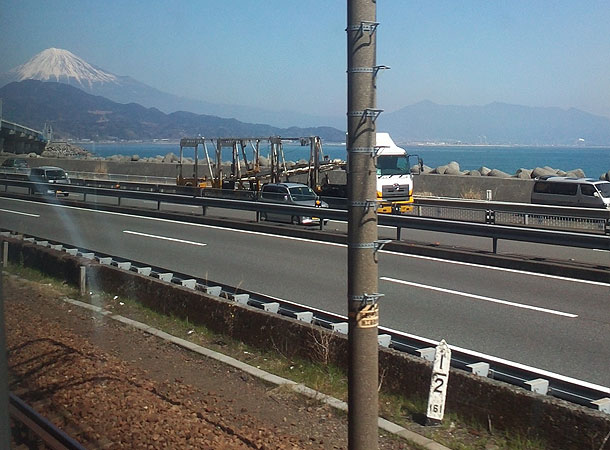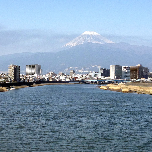 ランチに沼津港へ向かう途中の狩野川から見える富士山。