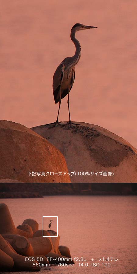 ヨンニッパに1.4倍のテレコンをつけての撮影したものが右の下。 その鳥の部分を100%撮影サイズのままトリミングしたものが上の写真です。 ※画像はweb用に少し粗くなっています。