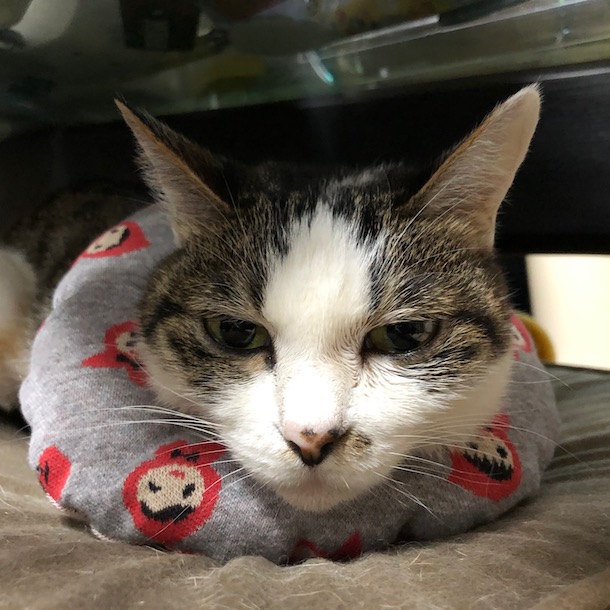 2019年12月27日2019年12月28日 布の服に変わった 表情が 普通にもどった! でも、首重い? 少しずつ元気になってきてる(というか 回復はやい!) そんな今日は仕事納めそして 餃子納め! たぶん。。。